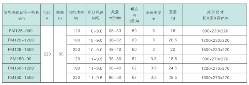 FM系列及RFM-1、RFM-11.RFMS累列风幕机和热风幕机的125或150是表示风轮直径,900或1500是表示风幕机本身的长度(单位mm)